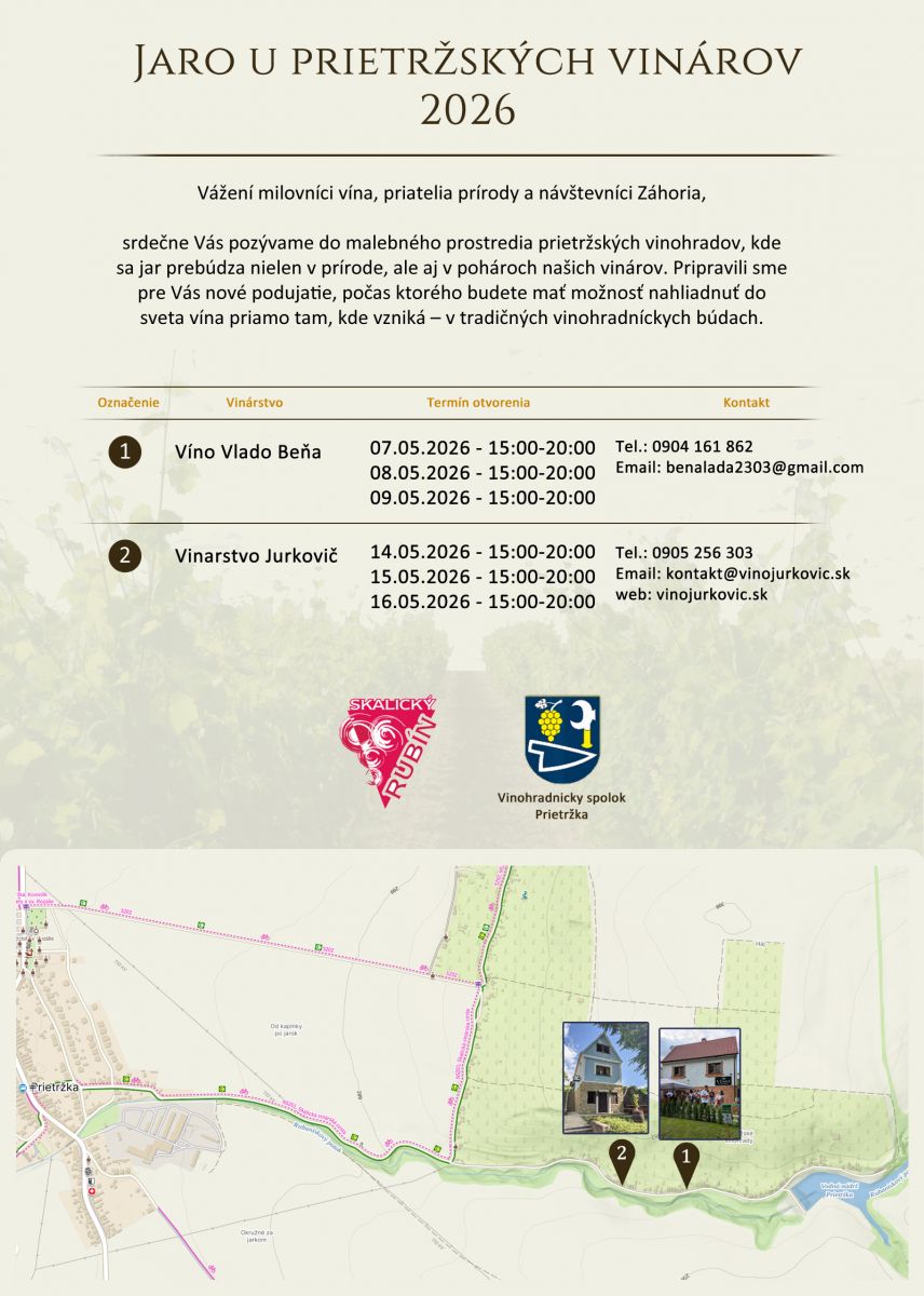 Pozývame Vás do prietržských vinohradov na jedinečné jarné podujatie, počas ktorého vinári otvoria svoje búdy pre verejnosť. V príjemnej atmosfére rozkvitnutej krajiny budete mať možnosť ochutnať vína priamo u ich tvorcov, spoznať vinohrady aj tradičnú vinársku kultúru regiónu. Príďte si vychutnať jar s pohárom dobrého vína a priateľskou atmosférou